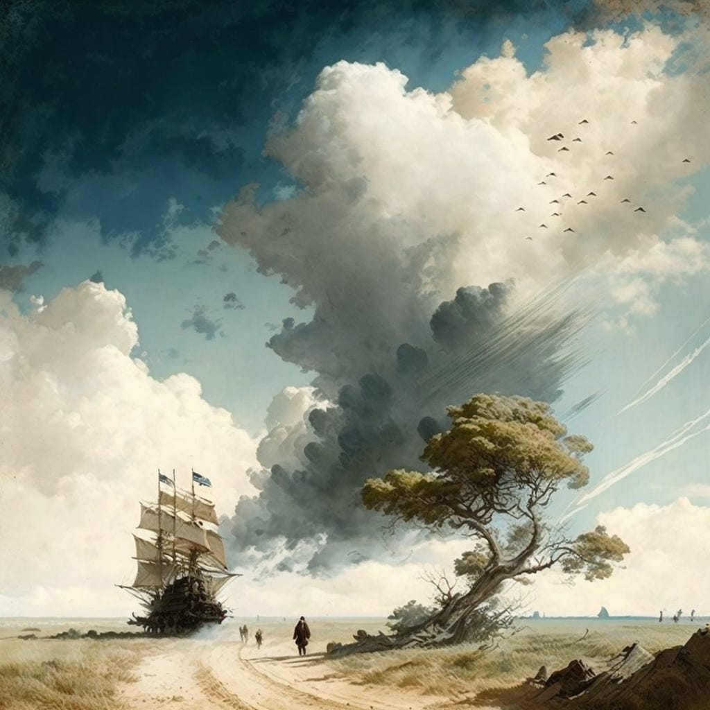 Thunder crashed so harshly within the encircling storm, Lonny was certain something on the Scallion was shattered. Clouds were roiling before them as the constant updraft tried to push them ever higher, an ever-swirling canvass of deep greys and blackness. The thunderstorm, with its blustering and crackling wild energy, coiled a new spray of thunderbolts from the next unexpected direction. The small crew had little choice except to be tossed in this sea of violent symphony.